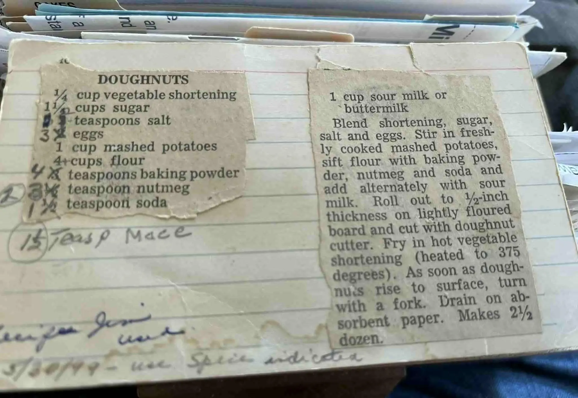 The above image is our very old family recipe for donuts, it traveled down from Jim Bartlett's grandmother's aunt, so it is at least 150 years old and perhaps came from a newspaper back then. It has been enjoyed by every generation since.